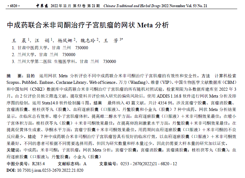 子宫肌瘤(uterine fibroid)存在于75%的妇女中,并可导致严重的并发症,同时也是子宫切除术的主要原因,虽然其在组织学和生物学上是良性的,但具有恶性发展的能力[1],因此,子宫肌瘤的治疗就显得格外重要。目前治疗子宫肌瘤主要采取两种方法:一是药物治疗,二是手术治疗(包括传统手术治疗、子宫动脉栓塞术和高强度聚焦超声)[2]。药物治疗中中医药治疗占据着一定的地位,市场上现有宫瘤宁胶囊、宫瘤消...